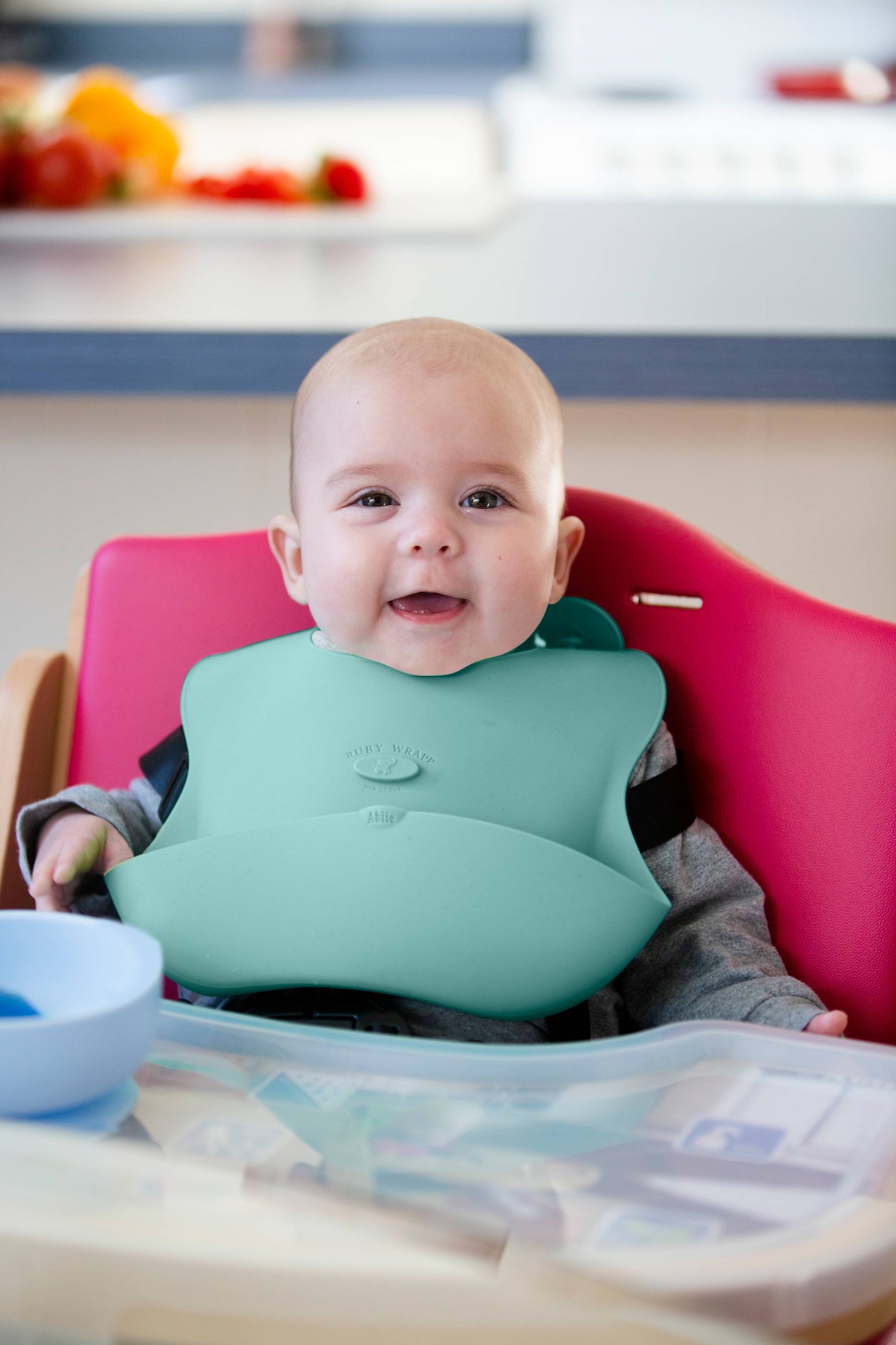 While your baby is enjoying delicious foods in their Abiie® high chair, keep mealtime messes in check with a Ruby Wrapp® Bib. Featuring a patented EZ-Wrap and BIB-LOCK, these baby feeding accessories can be folded and secured for compact, sanitary storage and travel use. Featuring lightweight food-grade silicone, the Ruby Wrapp’s soft and adjustable neckband is ergonomic and comfortable for sensitive necks.