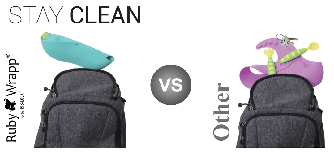 The patented BIB-LOCK keeps the eating surface protected from external contamination and makes it easy to roll up and store. Snap it up and take your Ruby Wrapp® silicone baby bibs anywhere.